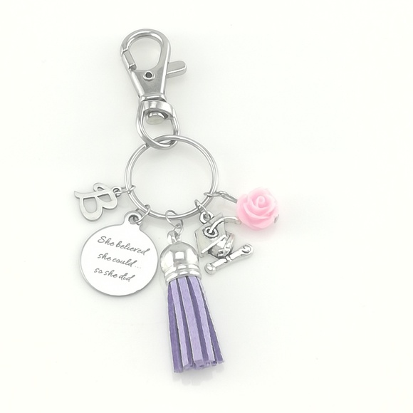 Graduation Key Chain – For a new graduate/Class of 2018/2019 with flower. Embellished With Print Lettering, Tassel charm and flower. Key Chain is made of a silver plated material. All materials are “silver plated” except the message (she believed she could and so she did) charm which is “stainless steel silver plated”. The keychain is 4 inches long with charms. Please let me know your letter, Tassel and flower color.