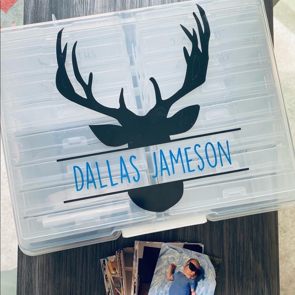 This photo storage box makes organizing your photos much easier than ever. I always find myself with photos stuck under books, stuffed into boxes, or just simply getting scratched and torn up from improper storage. Having a newborn, I knew there would be a ton of photos. Problem solved! You can choose from a variety of colors, fonts, and designs!