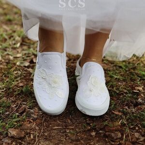 • Embroidered flower and pearls Bridal Custom made-to-order Slip-on shoes.