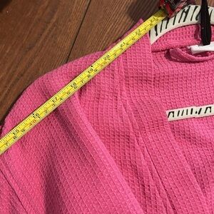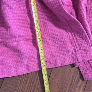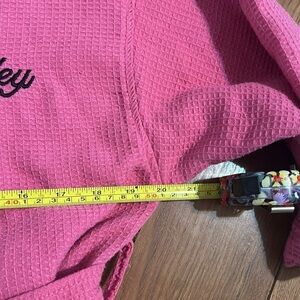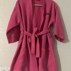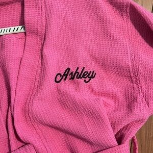 Pink waffle robe with Ashley embroidered on it. 3/4 sleeve. Belt. Pockets.
