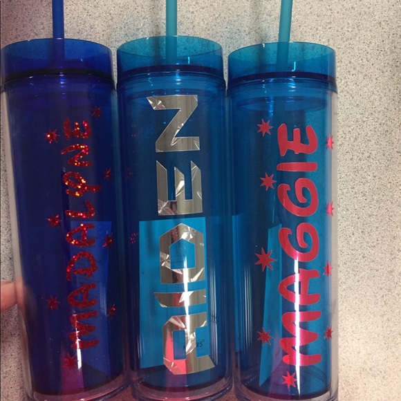 I can add any name to these cups. They are BPA free. They each come with matching color straw. Perfect stocking stuffer for Christmas! I use permanent vinyl, and I recommend hand wash only.
