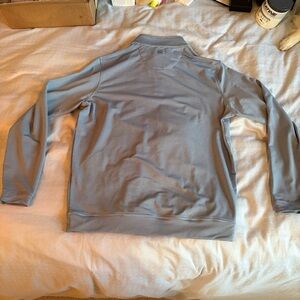 Perth Performance Quarter-Zip from Peter Miller in size L and a light blue and white striped color. Decent condition right eh only flaws being a slight tear in the left arm and pen mark on the back as pictured. Originally $140.