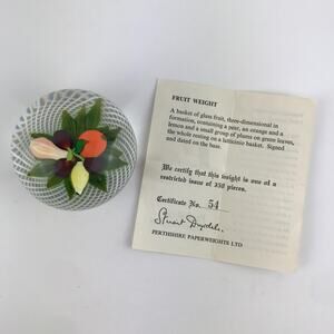 Vintage Perthshire glass art paperweight, lampwork fruit themed weight with 3D (three dimensional) orange/lemon/pear/plums on green leaves, spiral latticinio basket, signed with a "P1980" cane in base, includes certificate, part of the Annual Collection, edition: #54 of 350, collectible paperweight/home decor
