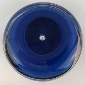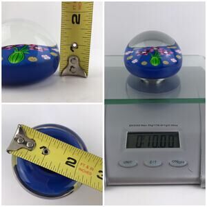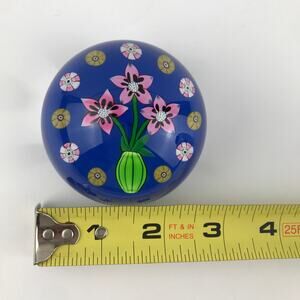 Vintage Perthshire glass art paperweight, three pink lampwork flowers in a green pot/vase surrounded by spaced millefiori canes, opaque blue ground, signed with a "P1984" cane in base, edition size: 124 made, part of the Annual Collection, collectible paperweight/home decor