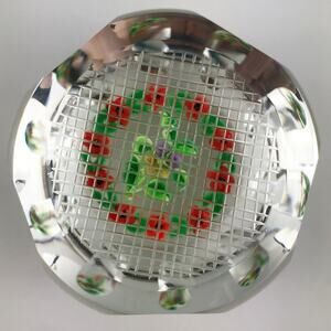 Vintage Perthshire glass art paperweight, central amethyst and yellow lampwork pansy flower surrounded by garland of red flowers and green leaves, clear ground, grid-cut/strawberry-cut base, faceted with top facet/5 large side facets/10 small side facets, scratch-signed? "P"? on base (see 6th photo for what I believe to be scratch-signature), part of the Annual Collection, edition size: 200 made, collectible paperweight/home decor