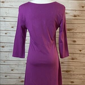 Purple; scoop neck; 3/4 length sleeves; oversized fit; hi-low curved hem