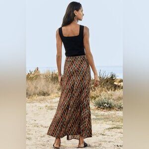 Ancient Wari tie-dye motifs look modern on our earth-hued, woven viscose maxi-skirt. The slim waist flows to an ankle-grazing hem. Single side slit; side zipper; unlined.