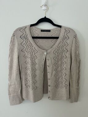 Light taupe knit cardigan with openwork stitch panels. Button-front closure with a scoop neckline. Lightweight and breathable for easy layering. Elegant neutral tone for versatile styling.