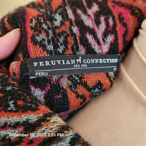 Jacquard knit coat in deep multi color swirls. Black ground with blue/grey, deep rust and pale blue. Button front and two patch pockets. Cotton, XL size. Stretches some. Relaxed chest when closed is 43". Overall length below the back collar is 37.5" long. Unlined. Comfy, casual but stylish. bought when still working, then Covid hit so hardly worn and now retired so really don't have a use for it.