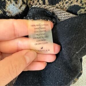 Great to used condition! Black and tan Pima cotton sweater dress. Hence of light blue and pale pink. Three-quarter sleeves hitting just at the knee. Crewneck in a popover style with no closure. Styled photo is shown as a similar dress in the same brand. Two imperfections circled in last photo.