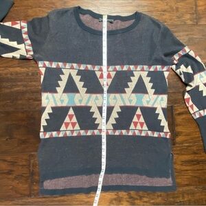 Gorgeous charcoal color with bold red and turquoise pattern. Scooped neckline. Wide ribbed cuffs. High low hem with split sides. Very soft and comfortable.