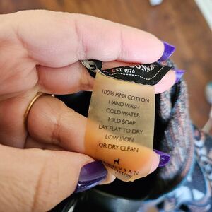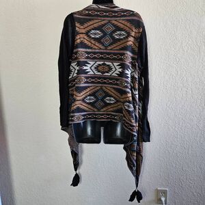 Beautiful Peruvian Connection open-front cardigan featuring an eye-catching geometric / Southwestern-inspired pattern. Designed in rich neutral tones of black, brown, tan, cream, and subtle rust accents, this piece has an elegant draped silhouette with long pointed hems that fall into soft tassel ends for added movement.