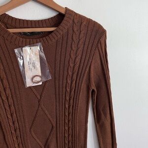 Beautifully crafted Peruvian Connection sweater in a rich brown hue with classic cable knit and diamond detailing. Made from 100% ultra-soft Pima cotton for a breathable and luxurious feel. Long sleeve, crew neck, and slim fit make it a versatile layering piece for fall and winter. Brand new with tag attached. Size Small.