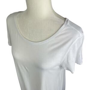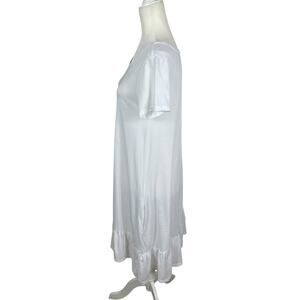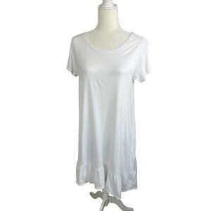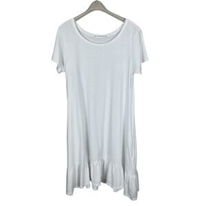 100% pima cotton white short sleeve t-shirt dress with ruffled hem. Pockets. Size small. Please see photos for measurements.