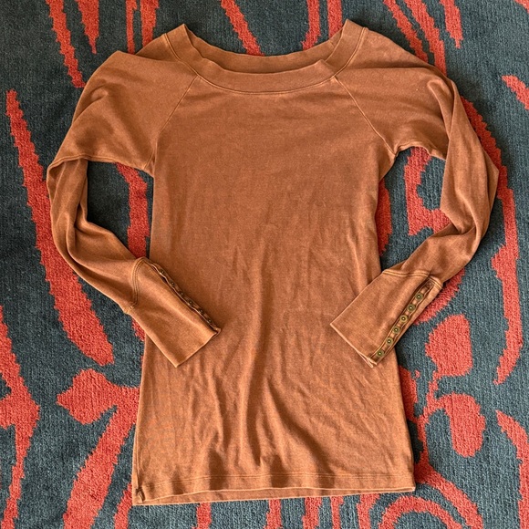Elegant rust long sleeve top with decorative button accents on sleeves. Perfect for versatile styling.