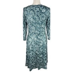 Peruvian Connection Sant’Elia Jersey Dress in the Lotus Blossom print, Denim Green colorway. Women’s Size Medium. This elegant dress features a soft, premium jersey knit that drapes beautifully, along with a timeless floral motif inspired by artisan textile design. A flattering silhouette suitable for work, travel, or elevated everyday wear.