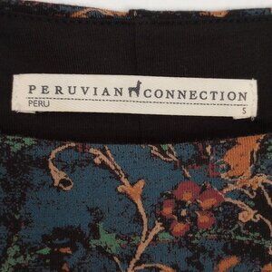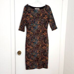 Peruvian Connection "Silk Road" dress, in fall colors print with abstract design. Ballet neckline, elbow length sleeves. Pretty dress for work, office, school, casual occasions.