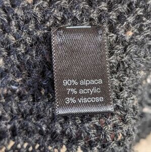Excellent preowned condition speckled black alpaca sleeveless shawl collar vest from Peruvian Connection. Soft black color with neutral speckles. Open front. Long line. Chunky knit with multiple knitting patterns. 90% alpaca 7% acrylic 3% viscose. No flaws or signs of wear. This looks and feels brand new!