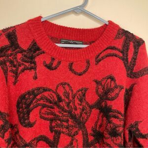 Elegant red sweater with bold black floral patterns. Perfect for adding a touch of sophistication.