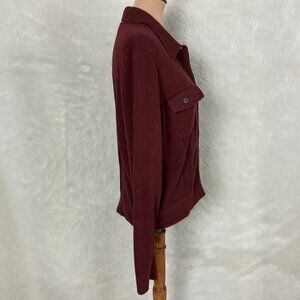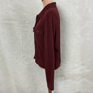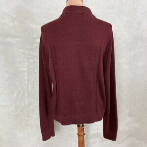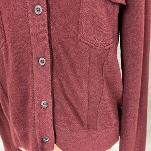 This is a burgundy red cotton knit, contrast stitching, long sleeve, polo collar, button front, flap patch pocket cardigan sweater jacket from Peruvian Connection. 100% pima cotton knit. No flaws. For reference the mannequin is a size 6-8 with measurements of: 34 in 26 in 35 in.