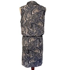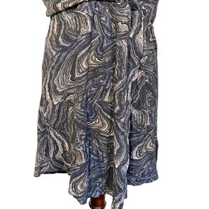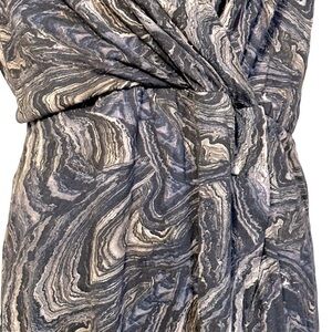 Peruvian Connection Venice Wrap Dress Large. Blue gray swirl sleeveless dress with lining in a marble print. Gorgeous and so soft! Approximate measurements 37” shoulder to hem, 18” pit to pit and 17” width at waist. Busy measurement may differ a bit depending on how you lay the dress due to the wrap style and it can certainly fit looser or tighter depending on busy size.