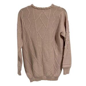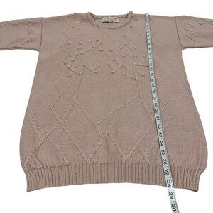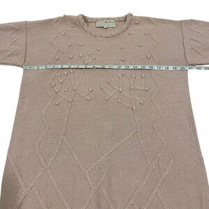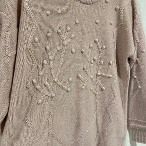 Elegant vintage pink alpaca sweater tunic with unique braided neckline. Features a raised bubble tree like pattern on the front and geometric pattern on the back. Cable knit and bubble pattern on sleeves with ribbed hem and cuffs. In good condition. Measurements in pictures