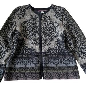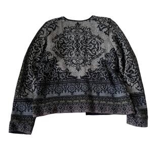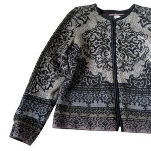 Soft alpaca wool with Nordic inspired pattern, zip closure, crew neck, soft shoulder pads, excellent preowned condition
