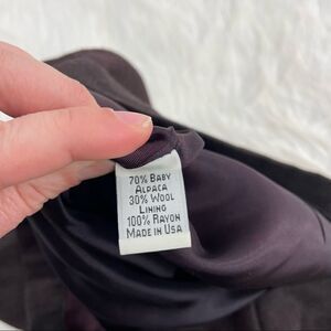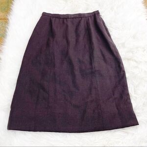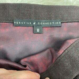 Peruvian Connection pencil skirt size 8. Purple/maroon/brown baby alpaca/wool material with polyester satin red ombre lining. Pull on with discreet side zipper. High waist with a side slit. No stains, one small hole on shell - not seen when worn and doesn’t go all the way through.