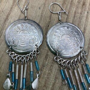 Peruvian Handmade Coin Silver Tone Dangling Hook Earrings