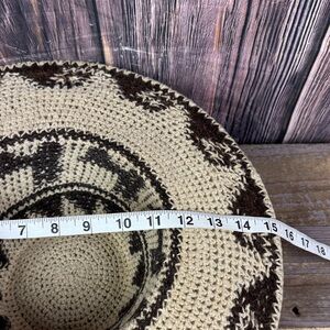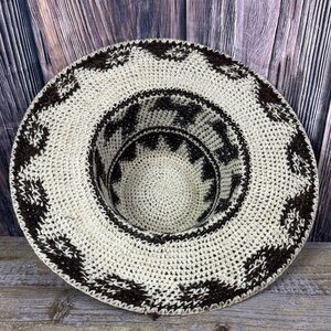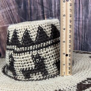 This item is a handcrafted Peruvian alpaca wool hat featuring a wide brim and traditional Andean patterns.