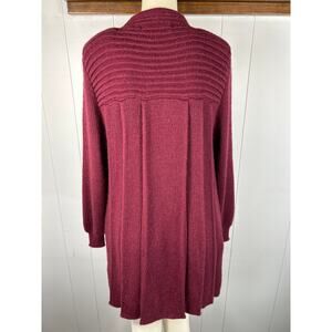 Peruvian Link three button long cardigan made of 100% alpaca. In the color burgundy or Merlot. One Size. See measurements. Could be a Medium or Large. Excellent condition. Shoulder pads.