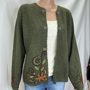 Peruvian Link Green Sweater Metal Clasps Embroidered Floral Alpaca Blend SZ M