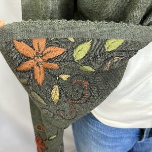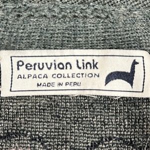 Peruvian link Alpaca Collection Green Sweater with metal clasp closures. Made of 50% alpaca and 50% acrylic with Floral and Embroidery on Front on Sleeves and around neck line. There is no size tag on this piece but I believe it due to measurements would be a size medium to large. Measurements are 22 inches from armpit to armpit flat and 22 1/2 inches in length. There are small lighter threads running through this piece as shown in pics, which are just part of the overall fabric. Good preowned condition. Please ask if you have any questions.