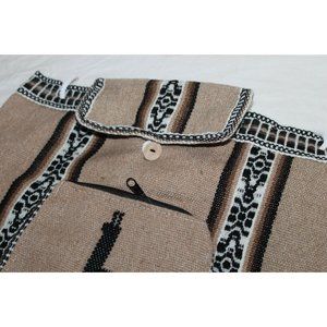 Made with woven fabric of brown, black and white, this bag features a llama