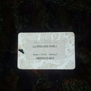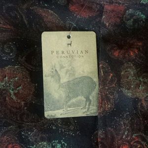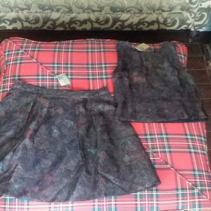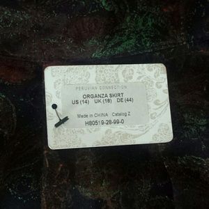 100% silk with an elaborate pattern. Shirt size large and skirt size 14 US. Has pockets :)