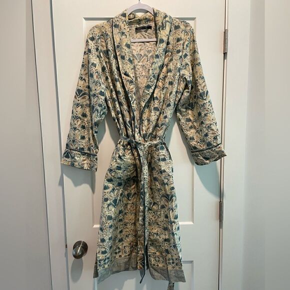 the robe is silky-soft Peruvian pima jersey, with patch pockets and a self-belt; ¾-sleeves.