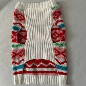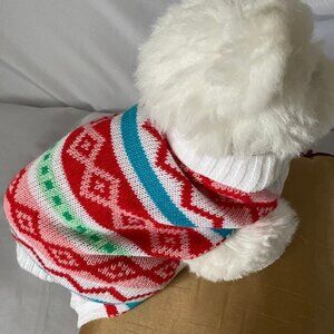 Pet Dog Cat Warm Cozy Knit Sweater...two front leg opening...multi colors pink red green blue white...neck girth 15" with stretch approximately 20" ...back length 12"...chest size 16"...colors red pink green white...NWOT...no flaws...see photos for details...011622