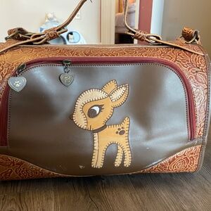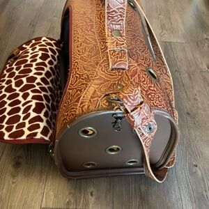 Very stylish Slightly used faux leather pet carrier for your small fur baby dog or cat with in her built-in blanket and an extra blanket great condition airline approved a sleeve to place your photo shoulder strap …hand strap ..and zipper closer.. 16 x 9 x 10