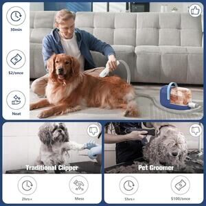 Simplify grooming and cleanup with this all-in-one pet vacuum system. Designed for shedding dogs and cats, it features 5 grooming tools, 5 combs, and a quiet 3L vacuum that captures up to 99% of pet hair. Includes a hair roller and massage nozzle for added comfort.