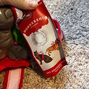 Red pet harness with a fun squirrel rider toy. Ideal for adventurous pets.