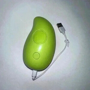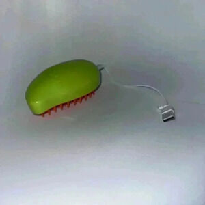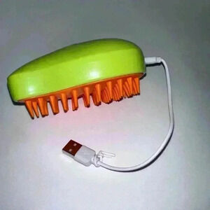 This is a pet grooming brush that is designed to remove loose hair from your pet. It is new and has never been used. It comes with a USB charging cable. The brush is green and orange and has a teardrop shape. It is made of plastic and has a rubberized grip. The brush has a button on the side that turns it on and off. The brush is also waterproof.