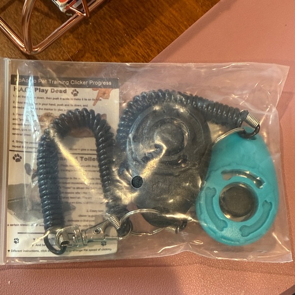 Pet training clicker with a blue button and black coiled strap. Ideal for effective pet training.
