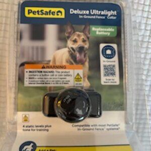 PetSafe Deluxe Ultralight In-Ground Fence Collar. New in original packaging. 4 static levels plus tone for training. Compatible with most PetSafe In-Ground Fence Systems. Replaceable battery.