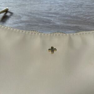 Classic and chic shoulder bag from Peta + Jain in a soft beige nylon with gold-tone hardware and a matching shoulder strap. Top zip closure with interior slip and zip pockets. Sleek shape with just the right amount of structure—perfect for everyday wear or a night out.