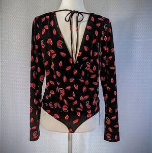 Petal Print Surplice Long Sleeve Red & Black Bodysuit NWT