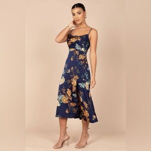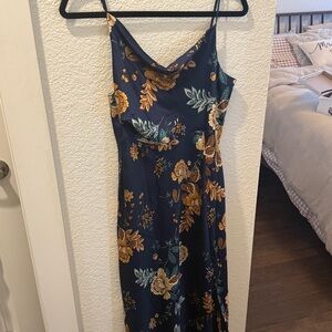 Floral cowl neck midi dress with slit. Gorgeous navy with blue/brown/cream/orange floral pattern. Perfect wedding guest dress! Only worn once, in excellent condition with no flaws.