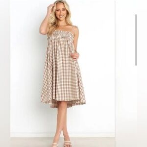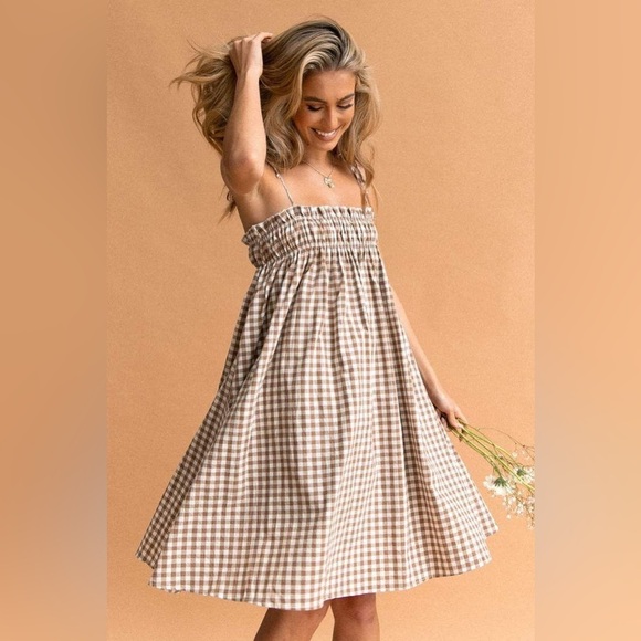 Charming gingham dress. Features a smocked bodice. Flowy and comfortable fit. Perfect for casual outings.