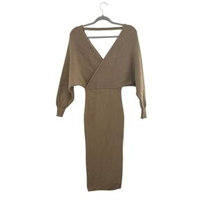 Keywords: Petal + Pup, Knit Dress, Bodycon Dress, Midi Dress, Wrap Dress, V Neck, Long Sleeve, Khaki Dress, Casual Dress, Party Dress, Cocktail Dress, Women's Dress, Size 2, Polyester Dress, Ribbed Dress