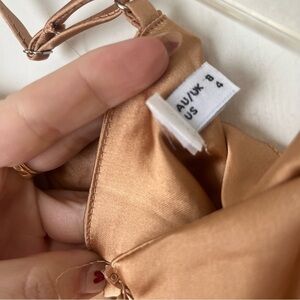 Petal & Pup Luella Gold Satin One Shoulder Maxi Dress 4. one shoulder style. maxi length. gathered side detail. back invisible zip. satin feel. partially lined. 100% polyester. Brand tag has been removed. Pit to pit 16", waist is 15", length 52". A few light snags in the satin