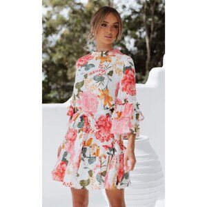Vibrant oversized blooms bring the garden to the party in this belted dress made for sashaying with its ruffled bell sleeves and flouncy tiered skirt.